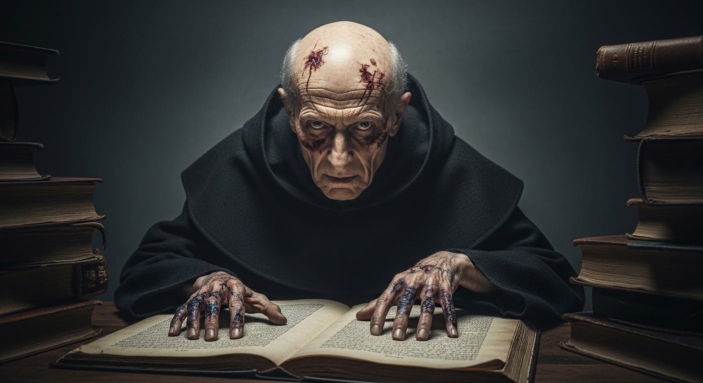 Yüz Hatları ve Kusurları: Başında tek bir tel saç bile yoktur, tamamen keldir. Kafatasının üzerinde ve şakaklarında, asit dökülmüş gibi duran garip yanık izleri vardır (Bunlar fiziksel bir ateşin değil, okuduğu lanetli kelimelerin zihnini yakarken derisine vuran izleridir). Cildi, asırlık eski bir kağıt gibi sarımtırak ve damarlıdır.